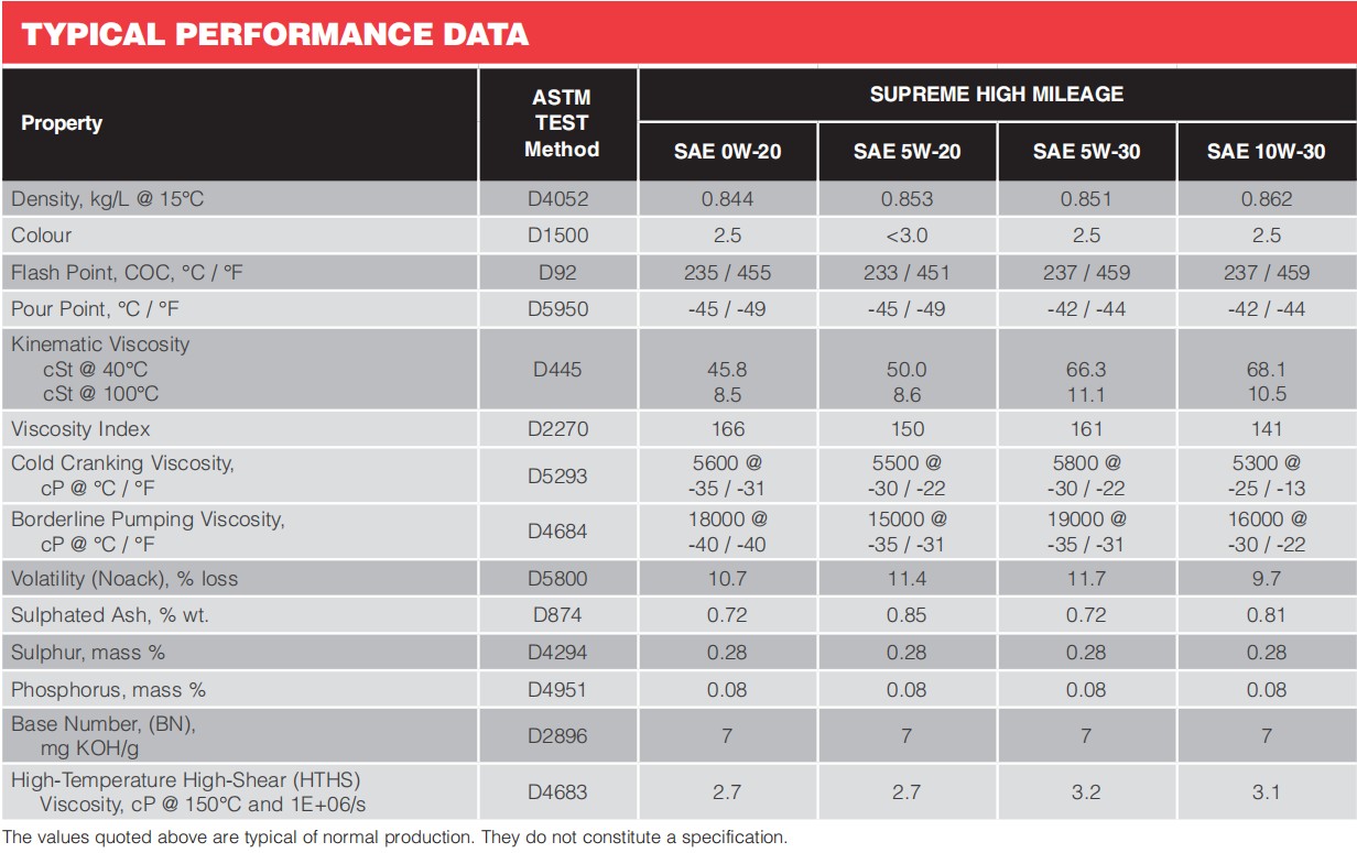 Моторные масла SUPREME HIGH MILEAGE рекомендуются для круглогодичного использования во всех бензиновых автомобилях, требующих жидкостей класса ILSAC GF-6A или API SP. Моторные масла SUPREME HIGH MILEAGE соответствуют или превосходят требования гарантии на новые автомобили для североамериканских и азиатских автомобилей, где рекомендуются моторные масла ILSAC GF-6A или API SP. Они полностью соответствуют предыдущим рейтингам производительности ILSAC и API, включая ILSAC GF-5 и API SN/SN PLUS. В них используется технология REGEN, которая обеспечивает дополнительные преимущества для бензиновых автомобилей с большим пробегом.