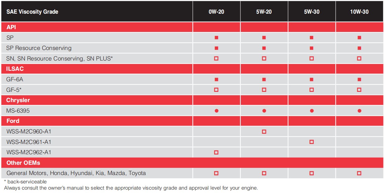 Всегда сверяйтесь с руководством по эксплуатации, чтобы выбрать соответствующий класс вязкости и уровень одобрения.